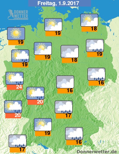 Sonst gibt es eine Mischung aus dichteren Wolken und kurzen sonnigen Phasen, örtlich gehen Schauer nieder. Die Höchsttemperaturen erreichen 17 bis 23 Grad. Der Wind weht meistens schwach bis mäßig und kommt überwiegend aus nördlichen Richtungen.