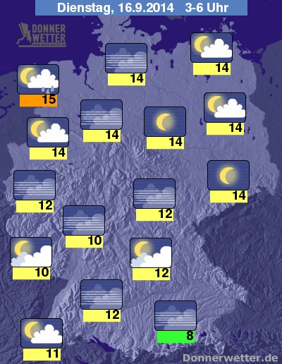 In der Nacht zum Dienstag können sich im Emsland und an der ostfriesischen Nordseeküste weiterhin einzelne Schauer entwickeln, sonst ist es überwiegend locker bewölkt, gebietsweise ist es klar. Es bleibt trocken, jedoch bildet sich stellenweise Nebel oder Dunst. Die Temperatur sinkt auf 15 Grad an der nördlichen Ems und bis 8 Grad im Voralpenland.