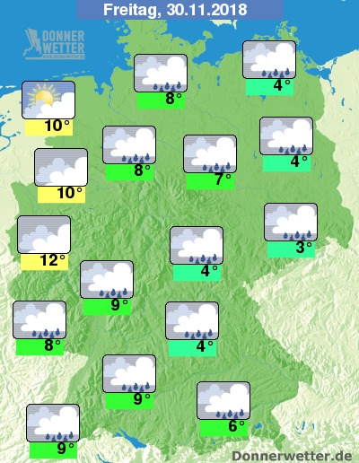 Abgesehen von kurzen Auflockerungen die zumeist im Nordwesten auftreten dominieren dichte graue Wolken. Zeit- und gebietsweise fällt Regen zum Teil auch Sprühregen. Achtung, in der noch vorhandenen Kaltluf in Ostdeutschland kann der Regen am Boden stellenweise gefrieren und zu Glatteis führen.