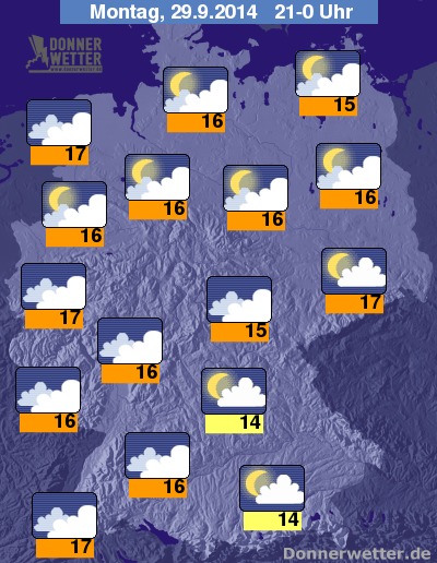 Heute Abend halten sich nach Westen hin häufig dichte Wolken, auch sonst ziehen meist einige Wolken durch, dabei sind jedoch zwischendrin auch mal die Sterne zu beobachten. Es bleibt weitgehend trocken. Die Abendwerte liegen bei einheitlichen 17 bis 14 Grad.