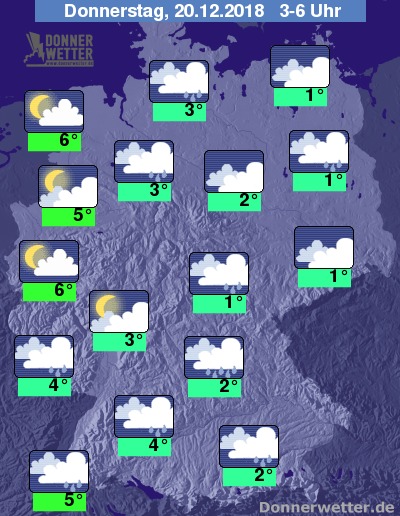 Während der zweiten Nachthälfte regnet oder nieselt es gebietweise, nur im Westen und Nordwesten zeigen sich gelegentlich Mond und Sterne.