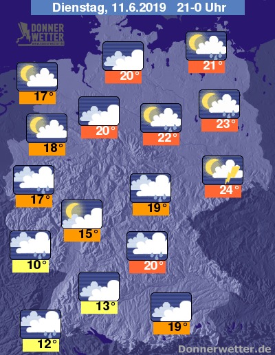 Am Abend muss in Sachsen, Thüringen und Nordbayern mit teils kräftigen Gewittern gerechnet werden. Westlich des Rheins fällt aus kompakten Schichtwolken gelegentlich Regen. Sonst gibt es eine Mischung aus dichteren Wolken und kurzen Aufheiterungen, Regen oder Schauer fallen jedoch nur vereinzelt.