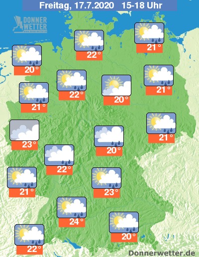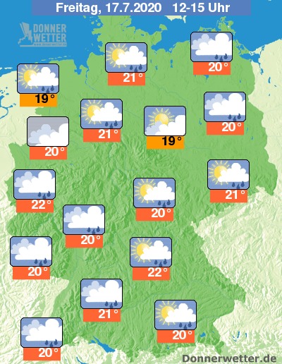 Am frühen Nachmittag werden die Wolken teilweise dichter und bringen einige Regenfälle. Bei sonniger Einstrahlung können sich in der feucht-warmen Luftmasse auch örtlich kräftigere Regengüsse und einzelne Gewitter entstehen. Besonders im Norden bleibt es regional auch trocken.