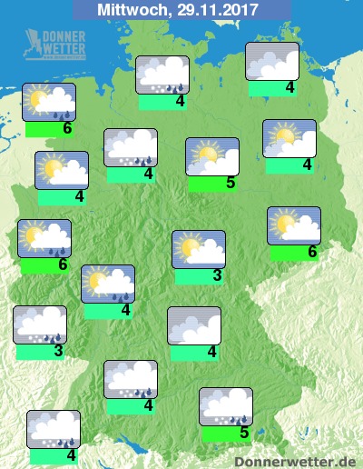 Vor allem im Süden halten sich dichtere Wolken, aus denen es gelegentlich schneit und in tiefen Lagen regnet. Sonst gibt es eine Mischung aus kurzen Aufheiterungen und örtlichen Schauerwolken. Dabei mischen sich teilweise bis in tiefere Lagen herab Schneeflocken und Graupelkörner unter die Tropfen. Im Norden gibt es gebietsweise auch längere sonnige Phasen. Die Höchsttemperaturen erreichen 1 bis 6 Grad. Im Bergland stellt sich leichter Dauerfrost ein. Der Wind weht meist nur noch schwach bis mäßig. In der kommenden teils klaren Nacht gehen die Temperaturen zurück und es kann verbreitet zu leichtem Frost mit der Gefahr durch überfrierende Nässe und Reif kommen. Lediglich im Südwesten ist regional mit Schneefall oder Schneeregen zu rechnen.