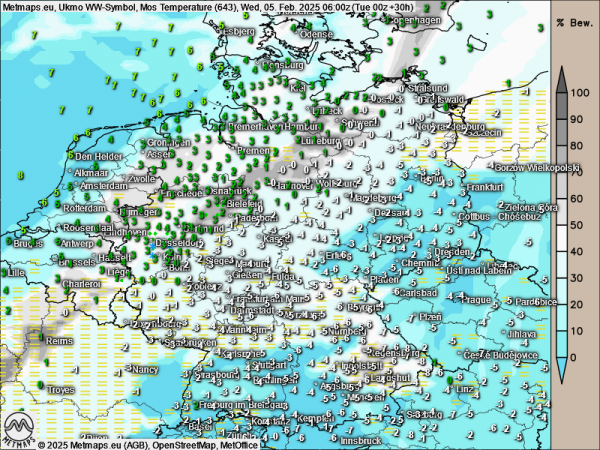 Eine schwache Kaltfront bringt etwas Nebelnässen, Sprühregen und Schnee in den Nordwesten. Achtung Glätte: