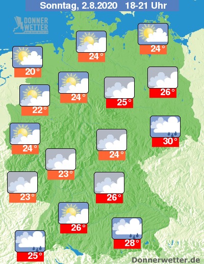 Heute Abend bilden sich im Süden und im östlichen Sachsen unter dichten Wolken zeitweise Schauer. Im Westen und Nordwesten ist es häufig auch aufgelockert, sonst überwiegend dicht bewölkt, dazu jedoch auch weitgehend trocken. Die Temperatur liegt noch bei etwa 20 Grad in Cuxhaven und bis zu 30 Grad in Dresden.