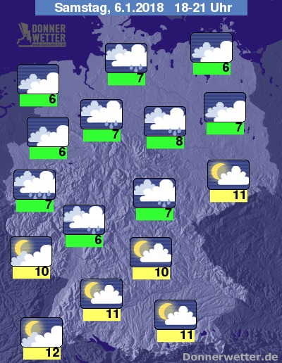Heute Abend überzieht ein breiten Regenband mit dichten Wolken und teils langanhaltendem Regen etwa die Nordhälfte des Landes. Südlich des Mains bleibt es hingegen meist nur locker bis aufgelockert bewölkt und dazu auch trocken. Im Küstenumfeld bleibt es bei dichten Wolken weitgehend trocken. Die Temperatur liegt bei milden 6 bis 12 Grad.