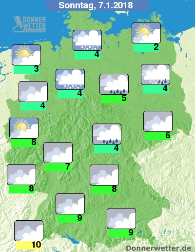 Am Sonntag bleibt es zum Großteil wolkenverhangen, dazu fällt vor allem im Norden noch gebietsweise Regen, zum Teil auch Schneeregen oder Schnee. Weiter nach Süden hin bleibt es zwar ebenfalls trüb, jedoch überwiegend trocken. Im Norden kommt im Laufe der zweiten Tageshälfte auch oft die Sonne zum Vorschein. Die Temperatur erreicht nur 2 Grad in Vorpommern und bis 10 Grad im Oberrheingraben.