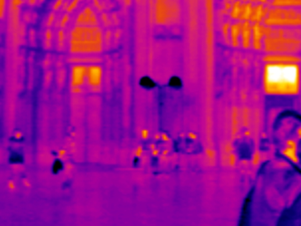 Hitze im Infrarotbild am Kölner Dom. Auf der Domplatte werden 35 Grad C heute Nachmittag gemessen. Auch an der Mosel, am Oberrhein und in Niedersachsen werden 32-35 GRad C erreicht.