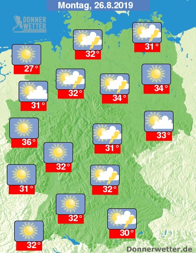 Am Montag strahlt wieder verbreitet die Sonne über dem Land, hier und da ziehen lockere Wolken durch. Im Bereich der Mittelgebirge und an den Alpen sind allerdings bei teils dichten Quellwolken lokale Schauer und Gewitter zu erwarten, im übrigen Land bleibt es bis auf wenige Ausnahmen weitgehend trocken. Die Temperatur steigt auf 27 Grad direkt an der Nordsee und auf heiße 36 Grad in der Kölner Bucht.