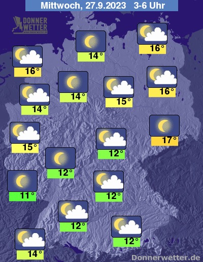 In der Nacht zum Mittwoch ist es zeitweise sternenklar, es zieht phasenweise aber auch leichte Bewölkung durch, dazu bleibt es trocken. Die Temperatur sinkt auf 17 Grad in Dresden und bis 11 Grad in Saarbrücken.