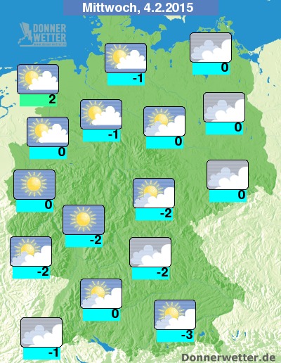 Am Mittwoch kann sich in vielen Landesteilen wieder häufiger die Sonne durchsetzen. So zeigt sie sich vor allem im Westen oft über einen langen Zeitraum, aber auch im Nordwesten, Norden und gebietsweise im Süden ist mit Sonnenschein zu rechnen. Meist dicht bleibt die Bewölkung dagegen im Osten, Nordosten und auch im Südwesten Deutschlands, hier kann gelegentlich etwas Schnee fallen, sonst bleibt es aber weitgehend trocken. Die Temperatur steigt auf -3 Grad im Allgäu und bis 2 Grad an der niederländischen Grenze.