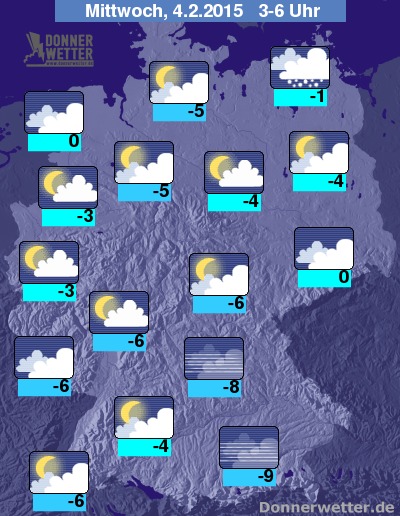 In der folgenden Nacht fällt vor allem im Nordosten, aber gebietsweise auch im Norden und Osten des Landes Schnee, dazu kann es glatt auf den Straßen sein. In den anderen Landesteilen ist es zum Teil aufgelockert, teils aber auch stark bewölkt oder neblig-trüb. Dabei bleibt es weitgehend trocken. Die Tiefstwerte liegen bei 0 Grad in Bremerhaven und bis -9 Grad in Teilen Oberbayerns.