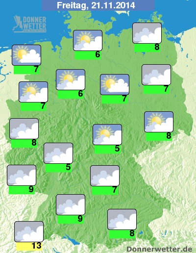 Der heutige Tag bescherrt vor allem dem Süden und Südwesten des Landes meist dichtes Gewölk, aber auch im Nordosten des Landes bleiben Auflockerungen selten, Regen fällt jedoch nur selten etwas. In den anderen Landesteilen ist es überwiegend aufgelockert, vor allem am Nachmittag auch gebietsweise locker bewölkt und es bleibt trocken. Die Temperatur steigt auf 5 Grad im Taunus und auf bis zu milde 13 Grad in Konstanz am Bodensee.