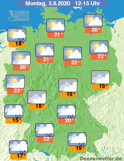 In den Nachmittagsstunden zeigt sich der Himmel über dem Norden zunächst noch heiter bis wolkig, am späteren Nachmittag auch stärker bewölkt, und es bleibt bis auf einzelne Schauer im Nordwesten überwiegend trocken. In der Südhälfte überwiegt am Montagnachmittag starke Bewölkung oder der Himmel ist bedeckt - dabei muss verbreitet mit Schauern gerechnet werden, die zeitweise auch ergiebiger ausfallen können.