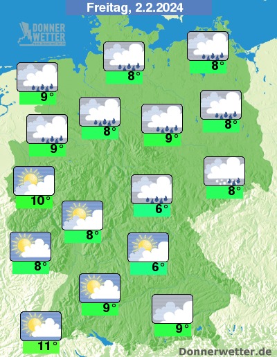 Am Freitag zeigt sich der Himmel über der Süd- und Südwesthälfte nach Nebel- / Hochnebelauflösung zumeist heiter oder es ist nur gering bewölkt. Es bleibt trocken. In den übrigen Landesteilen bleibt der Himmel dagegen bedeckt oder es ist stark bewölkt, dabei muss im Tagesverlauf immer wieder mit Regen oder Sprühregen gerechnet werden. In den östlichen Mittelgebirgen anfangs auch noch mit Schnee vermischt.