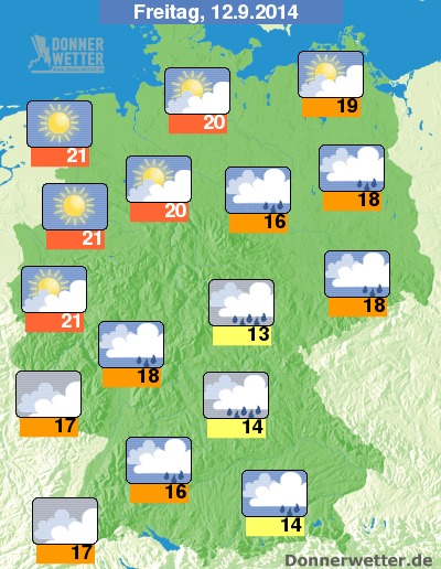 Am morgigen Freitag ziehen in den Osten und Süden die Ausläufer eines Tiefs über Osteuropa, dabei fällt bei vielfach dichten Wolken immer wieder Regen. Im Norden und Westen wird es dagegen bei heiterem bis sonnigem Himmel trocken bleiben. Die Temperatur steigt auf teils nur 13 Grad im südlichen Thüringen und bis 21 Grad entlang der Ems.
