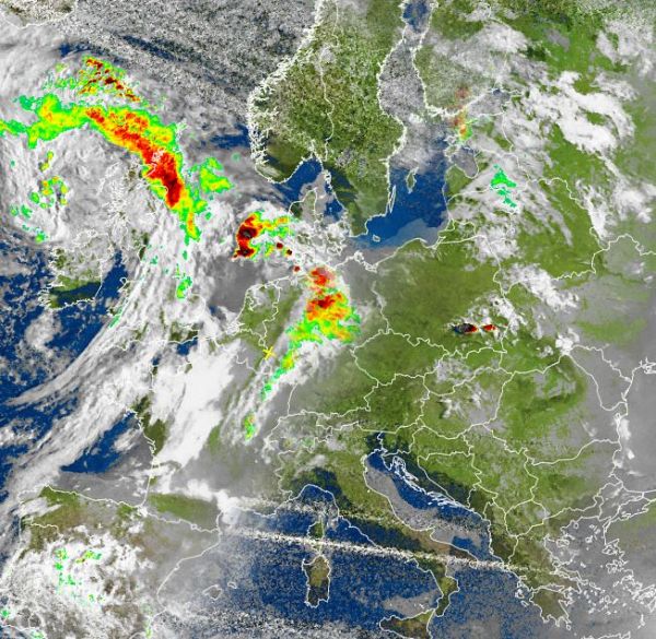 Auf dem Satellitenfoto von heute Morgen zeigen sich Gewittercluster über der Nordhälfte von Deutschland, dabei bildeten sich vielerorts kräftige Schauer und Gewitter. Im größten Teil von Deutschland schien jedoch auch am Morgen schon die Sonne von einem oft blauen Himmel.
