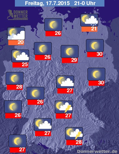 Heute Abend zeigt sich der Himmel zum Großteil sternenklar, im Nordwesten und im Nordosten und Osten ziehen gebietsweise einige Wolken durch, dabei bleibt es aber überwiegend trocken. Im Süden der Republik besteht jedoch ein leichtes und teils auch mäßiges Gewitterrisiko, aber auch hier bleibt es zum größten Teil trocken. Die Abendtemperatur liegt bei heißen 30 Grad in Leipzig und bei etwa 20 Grad in Ostfriesland.