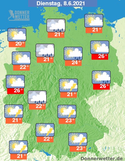 Am Dienstag zeigt sich der Himmel über dem Westen, Nordwesten sowie Nordosten des Landes teils heiter, teils locker bewölkt und es bleibt meist trocken. In den übrigen Landesteilen überwiegt heute wechselnde oder starke Bewölkung, vor allem in der Landesmitte sowie im Süden sind dabei im Tagesverlauf immer wieder Schauer und kräftige Gewitter möglich. Örtlich besteht Unwettergefahr durch Starkregen.