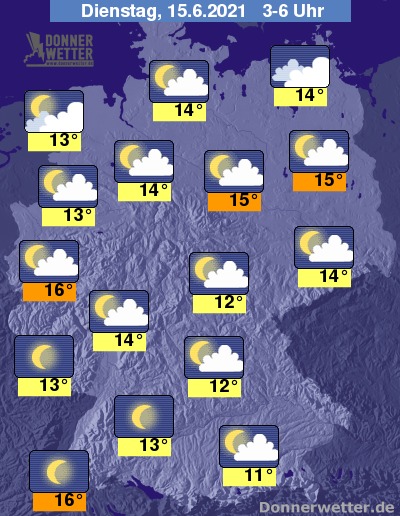 In der kommenden Nacht ist der Himmel im Süden meist sternenklar, sonst ist es überwiegend locker oder aufgelockert bewölkt. Es bleibt landesweit trocken bei Tiefstwerten von 16 Grad in Bonn und etwa 11 Grad in Augsburg.
