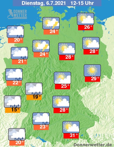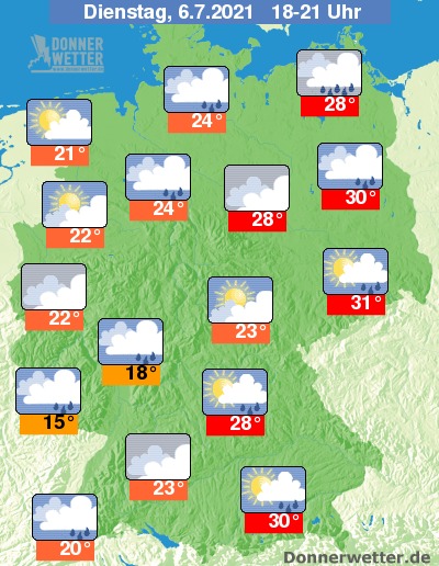 Heute Nachmittag ist es in den östlichen Landesteilen noch verbreitet heiter und trocken, sonst zieht jedoch schon verbreitet dichte Bewölkung durch und es können sich vielerorts Schauer und lokal auch Gewitter entwickeln. Die Temperatur liegt bei kühlen 15 Grad am Pfälzer Wald und bis 31 Grad in München.