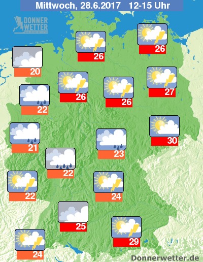 Heute Nachmittag ziehen häufig dichte Wolken durch, dabei bilden sich wiederholt Schauer und örtliche, zum Teil auch kräftige Gewitter. Zwischendurch kann sich auch die Sonne blicken lassen. Die Temperatur liegt bei Werten zwischen 20 Grad in Cuxhaven und bis 30 Grad in Dresden.