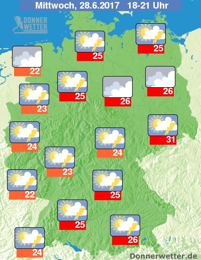 Heute Abend sind teils heitere Abschnitte, teils aber auch kompakte Wolken möglich, es bilden sich gebietsweise, vor allem im Süden auch häufige Schauer und örtlich, teils kräftige Gewitter. Die Temperatur liegt bei 22 Grad in Emden und bis 31 Grad in Dresden.