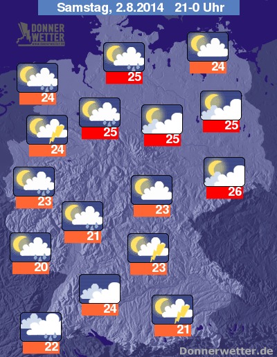 Am Abend ziehen meist viele, verbreitet auch dichte Wolken durch, dabei können sich gebietsweise, teils kräftige Schauer und Gewitter weiter entwickeln. Es besteht deutschlandweit ein mäßiges bis hohes Gewitterrisiko, wobei der Osten und Berlin trocken bleibt. Bei allerdings schwülwarmen 26 Grad in Dresden und 20 Grad am Pfälzer Wald kann man leicht ins Schwitzen geraten.