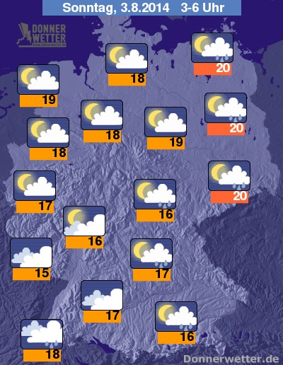 In der Nacht zum Sonntag ziehen sich die Gewitter nach und nach weiter nach Osten zurück, vor allem im Nordosten, sowie im Südosten und Süden gewittert es noch häufig bis in die Morgenstunden, sonst ist es teils aufgelockert, teils stark bewölkt, aber zumeist trocken. Die Temperatur sinkt auf 20 Grad in Berlin und etwas kühlere 15 Grad am Nordpfälzer Bergland.