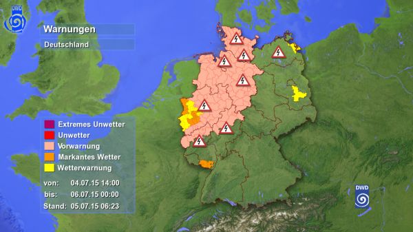 Heute ist es besonders vom Osten bis in den Süden verbreitet heiter bis sonnig und bis zum Abend weitgehend trocken. Weiter nach Westen und Norden hin ist es gebietsweise heiter, zunehmend ziehen aber auch kompakte Quellwolken auf, die zu regional unwetterartigen Gewittern führen. Gegen Abend sind auch im Osten und im Südwesten teils schwere Gewitter möglich. Die Höchstwerte liegen bei schwülwarmen 25 Grad an der Nordsee und sehr drückenden 37 Grad in Stuttgart.