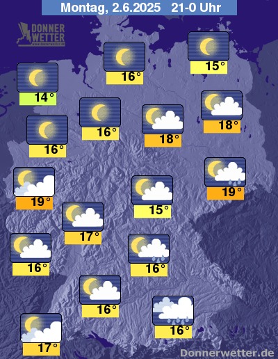 In der Nacht zum Dienstag fällt südlich der Donau weiterhin teils schauerartiger und gewittriger Regen, im Verlauf nachlassend. In den übrigen Landesteilen ist es sternenklar oder nur gering bewölkt und es bleibt trocken.