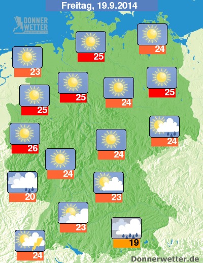 Für das kommende Wochenende zeigen die aktuellen Hochrechnungen der Wettermodelle ein Tiefdruckgebiet über Frankreich, das mit seinen Ausläufern feuchtmilde Luftmassen von Südwesten her nach Deutschland treibt. Insgesamt ist es aber in weiten Teilen unseres Landes noch sonnig und warm und Schauer nur selten. Die Weinfeste und die Besucher des Oktoberfestes können sich freuen. Mehr Deutschlandwetter bis zum Wochenende findet sich hier.