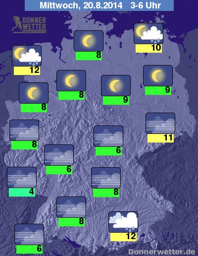 In der Nacht ziehen am Alpenrand und im Küstenumfeld häufig dichte Wolken durch und es kann hier und da Regen fallen, sonst ist der Himmel verbreitet klar und es bleibt weitgehend trocken. Die Temperatur sinkt auf 12 Grad im Emsland und etwa 4 Grad am Pfälzer Wald.