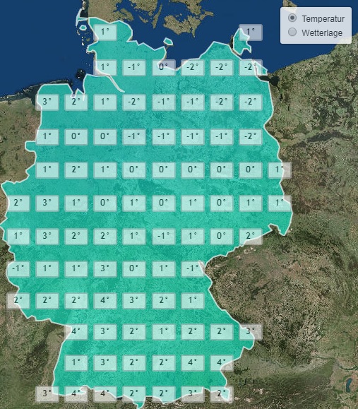 Die Tiefstwerte liegen dabei im Nordosten verbreitet knapp unter dem Gefrierpunkt und im Schwarzwald und auf der Alb mit bis zu 4 Grad knapp darüber.