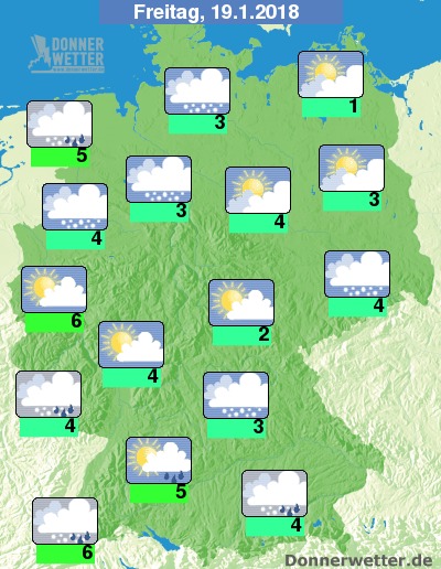 Im Lauf der Nacht zieht Sturmtief "Friederike" über Tschechien und Polen ostwärts ab, sodass die Windgeschwindigkeiten hierzulande allmählich zurückgehen. Auch die Niederschläge lassen nach Durchzug der Front vorübergehend nach, bevor mit Eintreffen der Kaltluft neuerliche Schnee- und Regenfälle einsetzen. Dabei ist vor allem in den Morgenstunden mit Straßenglätte und überfrierender Nässe zu rechnen.
