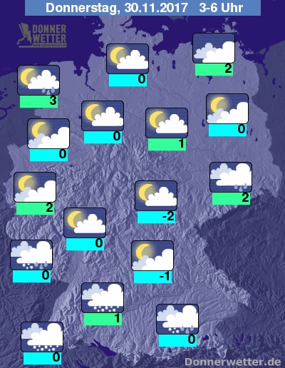 In der bevorstehenden Nacht bleibt es vor allem über dem Süden verbreitet bedeckt bei zeitweiligem Regen, Schneeregen oder Schneefall. dazu besteht erhöhte Glättegefahr! Im übrigen Bundesgebiet ist es oft leicht bis aufgelockert und nur hier und da auch dicht bewölkt, dazu bleibt es größtenteils trocken. Die Temperatur sinkt auf 3 Grad in Wilhelmshaven und bis -2 Grad im Eichsfeld.