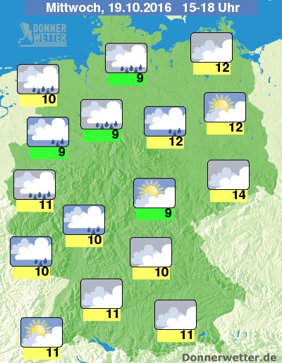 Am Nachmittag und frühen Abend ändert sich an dem Wetterbild nur wenig. Im Westen und entlang der Weser regnet es teils stark und die Sonne schafft es nur selten durch die Wolkendecke. Im restlichen Land ist es überwiegend bedeckt. In Brandenburg und Thüringen zeigt sich öfter mal die Sonne.