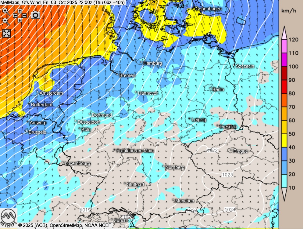Im Süden und Osten weht ein schwacher, sonst mäßiger, an der Nordsee auch frischer und böiger Südostwind. Auf den Inseln sind auch stürmische Böen möglich.