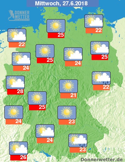 Im Anschluss daran geht es voraussichtlich sommerlich weiter. Bei Temperaturen zwischen 24 und 33 Grad bleibt es heiter bis wolkig mit örtlichen Regengüssen und Gewittern.