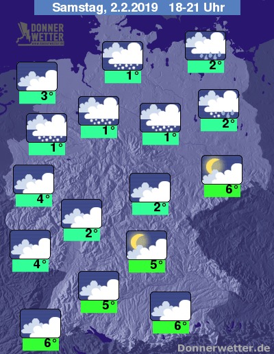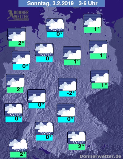In der Nacht zum Sonntag ist der Himmel bedeckt, im Süden fällt zeitweise, sonst fällt gebietsweise Schnee oder Schneeregen. Vielerorts bleibt es auch trocken bei Tiefstwerten von 2 Grad entlang des Rheins und bis -2 Grad im Thüringer Becken.