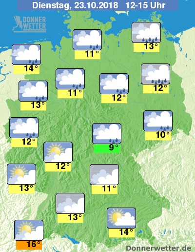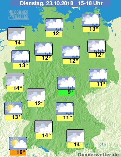 Im Laufe des Nachmittags ändert sich an der Wetter- und Temperaturverteilung kaum was. Im Südwesten und im Alpenvorland bleibt es bei einer recht freundlichen Mischung aus Sonne und Wolken trocken, sonst fällt weiterhin zeitweise Regen oder Sprühregen, nach Nordosten zu auch mal kräftiger. Am kühlsten ist es im Thüringer Becken, am wärmsten im Breisgau.