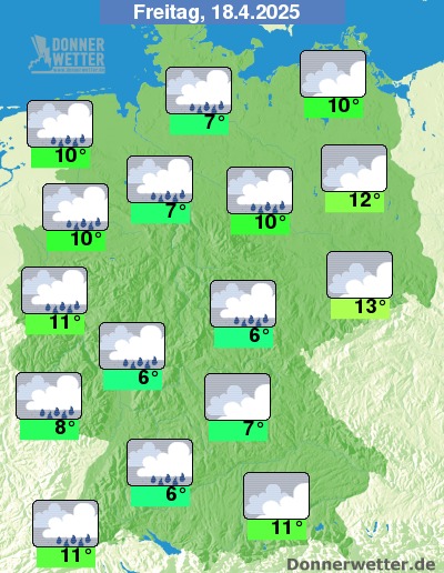 Am Karfreitag zeigt sich der Himmel über weiten Landesteilen stark bewölkt oder es ist bedeckt, dabei muss verbreitet mit teils kräftigem Regen gerechnet werden. In der Osthälfte sind lokal auch Gewitter möglich.