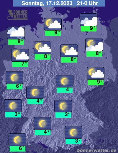 In der Nacht auf Montag bleibt der Himmel über der Nordhälfte stark bewölkt oder es ist bedeckt, zeitweise kann leichter Regen fallen. Weiter südlich ist es häufig sternenklar oder nur gering bewölkt, verbreitet kann sich Nebel oder Hochnebel bilden.