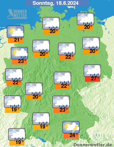 Am Sonntag zeigt sich der Himmel meist wechselnd oder stark bewölkt, dabei muss verbreitet mit schauerartigem und teils gewittrigem Regen gerechnet werden, im Tagesverlauf in die Ost- und Nordosthälfte verlagernd. Im Westen und Nordwesten ist es später bei auflockernder Bewölkung trocken.