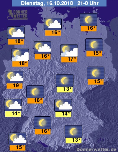 Am Abend lassen letzte Schauer nach und der Himmel präsentiert sich teils bewölkt, teils klar. Die untergehende Sonne spendet vielerorts noch goldene und wärmende Strahlen. Vor Beginn der Dämmerung liegen die Temperaturen noch bei angenehmen 20 bis 24 Grad, in den Ballungsgebieten des Westens teilweise sogar noch über 25 Grad.