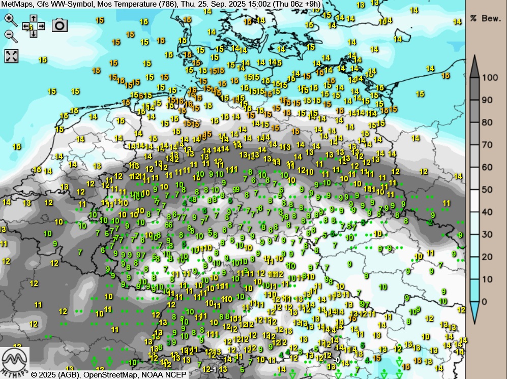 Am Donnerstagnachmittag fällt vor allem über der Landesmitte zeitweise noch etwas Regen; im weiteren Verlauf lässt dieser dann allmählich nach. In der Südhälfte muss am Nachmittag mit Schauern gerechnet werden. Im Norden bleibt es in den Nachmittagsstunden unter heiterem oder sonnigem Himmel trocken.