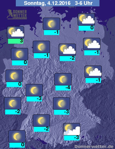 In der kommenden Nacht funkeln über dem Bundesgebiet verbreitet die Sterne. Lockere Wolken ziehen gebietsweise über den Nordosten, Osten, den Alpenrand und das Nordseeumfeld. In den übrigen Gebieten ist es jedoch weitgehend sternenklar, dazu bleibt es landesweit trocken. Die Temperatur sinkt auf 3 Grad an der Nordsee und bis -4 Grad in Unterfranken.