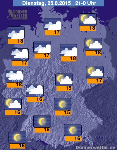 In der Nacht verstärkt sich der Regenfall im Westfalenland. Ebenso sind im Münsterland und im Rheinland kurze Schauer möglich. Der Süden Deutschlands zeigt in der Nacht immernoch einen klaren Himmel an. Der Östliche Nachthimmel wird von Wolken bedeckt sein, die bis in den Harz ziehen.