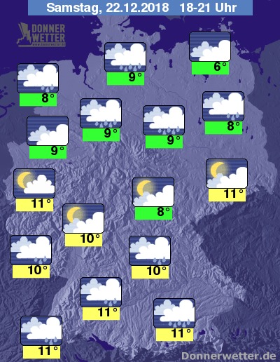 Heute Abend ist es weiterhin meist stark bewölkt, vor allem über der breiten Landesmitte lockert es hier und da auf, dazu ist es hier auch meist trocken, im übrigen Land fällt gebietsweise Regen. Die Temperatur liegt zwischen 6 und 11 Grad.